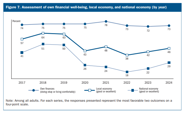 When it comes to the economy, people have also been proven to give a much worse rating to the performance of the national and local finances than their own household situation. Take this survey, from the US Federal Reserve, which showed that, in 2024, 73% of Americans rated their own financial situation while only 29% felt the same about the national economy.