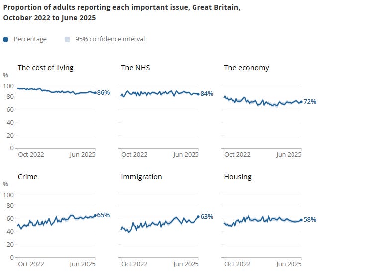 I’ve done this analysis to investigate whether the national-level situation in the UK is as dire as many people claim. But of course, averages and national-level statistics present an impression in which extremes of opinion or experience are smoothed away. The experience of living in the UK in 2025 is certainly not universal. There are segments of the population with specific grievances and burying those away by pointing to overall statistics that show ‘everything is fine’ is not good politics (nor the intention of this piece).