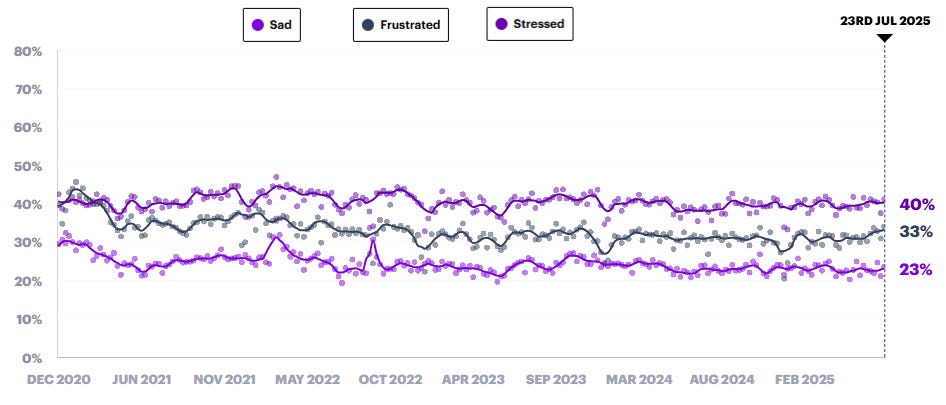 The lines are very steady and there are no down- or up-turns in recent weeks that would suggest mass civil unrest is on the cards. Another poll shows life satisfaction tracking at a pretty solid 6 out of 10 the whole time it’s been measured. But this YouGov data only covers a five-year period - maybe what’s being picked up here is a more persistent and dangerous low mood.