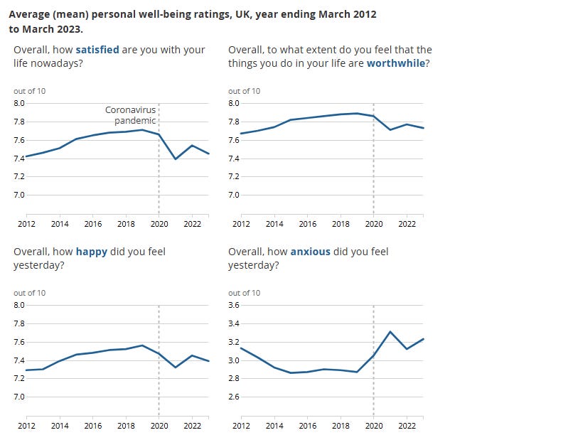 You might say that people’s self-reported personal wellbeing is a separate issue to how they feel about the state of the country, and that happy people can still boil with fury when they think about their leaders.