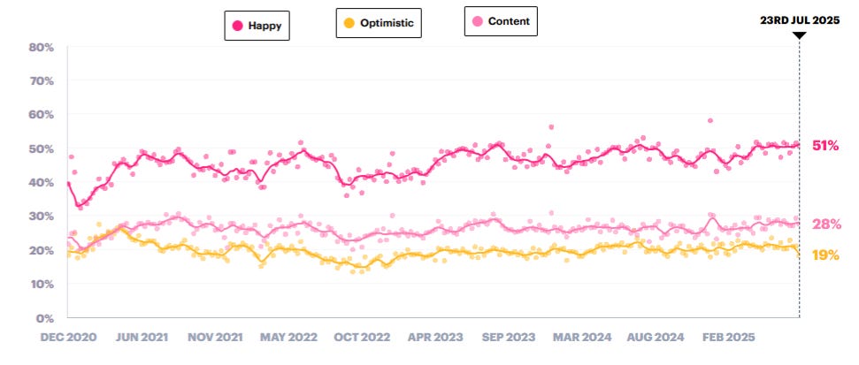 Without wanting to sound patronising, what’s missing is some perspective. People are clearly able to apply perspective when reporting that their lives are ‘happy’ overall even if they didn’t feel that way for the majority of the past week. The media, by design, does not do the same. And let’s face it we all revel in a bad vibe, providing it’s not in our own immediate lives.