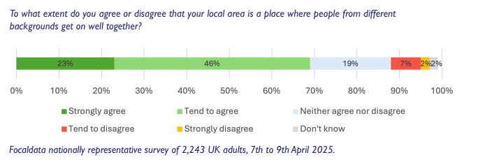 Of course, the polling in ‘Shattered Britain’, which suggested a dangerously pessimistic mood, can’t be discounted. But this was a one-off survey, and without context as to how people would have answered these questions two or ten years ago, we really can’t point to it and warn of imminent social collapse. Another recent thinktank report, the accusingly-titled ‘The State of Us’, found that only 9% of people reported a lack of social cohesion in their area.
